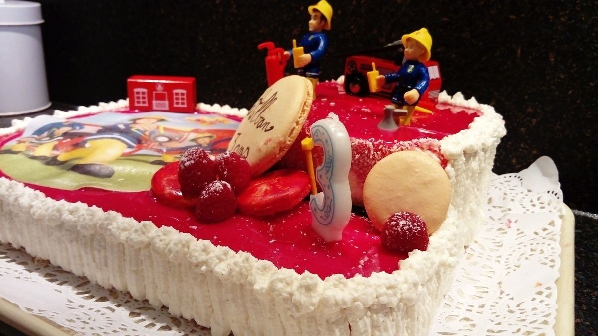 recette pour un gâteau de 15 à 18 personnes : 1) préparez une génoise pour un moule de 35/25 et un moule de 18cm clarifier 4 oeufs, monter les blancs en neige bien ferme en y ajoutant 125 g de sucre (cela vous fera une belle meringue), ajoutez 4 jaunes en fouettez moyennement ,ajoutez 125 g de farine tamisé + 1/2 pq de levure, étendre cette préparation dans vos moules , cuire à four chaud 190° pdt 20 min 2) préparez votre mousse à la framboise pour le grand rectangle faire ramollir 14 g de gélatine dans de l'eau , mettre 360 g de pulpe de framboise dans un saladier + 80 g de sucre, faite chauffer une tasse de pulpe au micro onde afin de faire fondre la gélatine dedans puis bien mélangez avec le reste de la pulpe froide , montez 400 g de crème liquide à 30% en crème fouettée , incorporez la pulpe, mettre sur votre génoise refroidi et au congélateur 3) faire pour le petit moule une mousse chocolat blanc faire ramollir 7g de gélatine , faire fondre 100g de chocolat blanc , montez 200g de crème en chantilly, incorporez la gélatine dans votre chocolat fondu et mettre la chantilly, versez dans votre moule 18 cm de diamètre, mettre au congélateur 4) préparez votre glaçage miroir rouge (voir recette entremet framboise croustillant) 5) sortir vos entremets , mettre ce glaçage dessus lorsqu'il est à 30° 6) sur le moule rectangle décorez de chantilly vanille et le rond de noix de coco 7) j'ai décorez de macarons (voir la recette macakeurd'anne) et de petits sujets, n'hésitez pas à me demander des conseils, si vous souhaitez l'essayer !!!